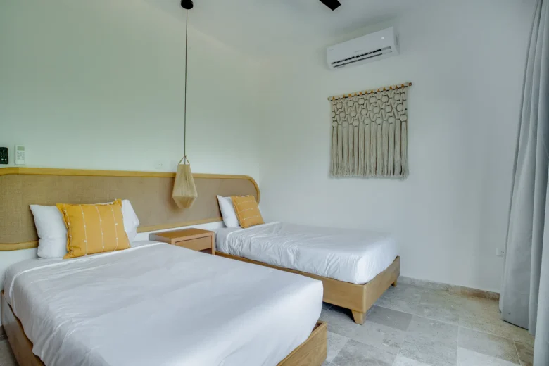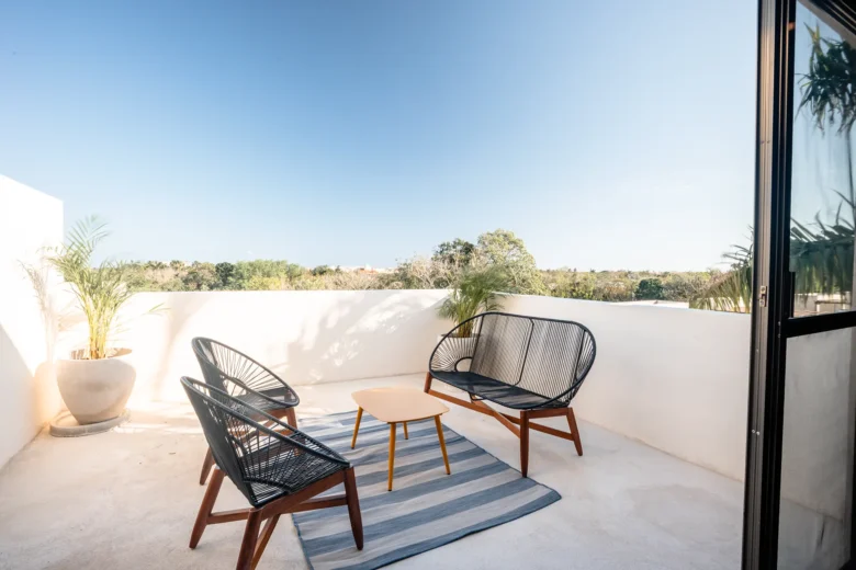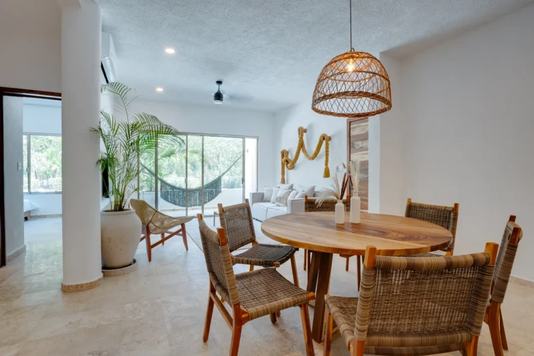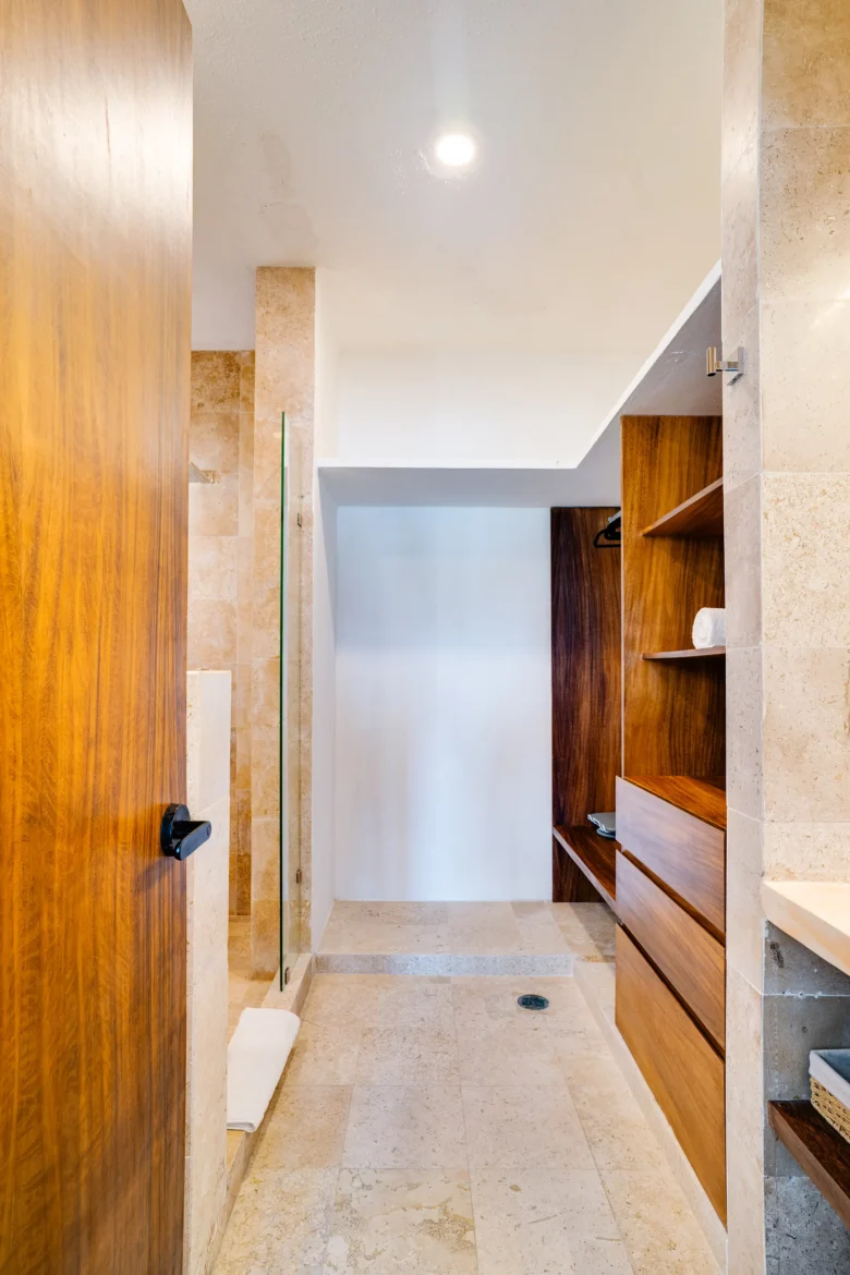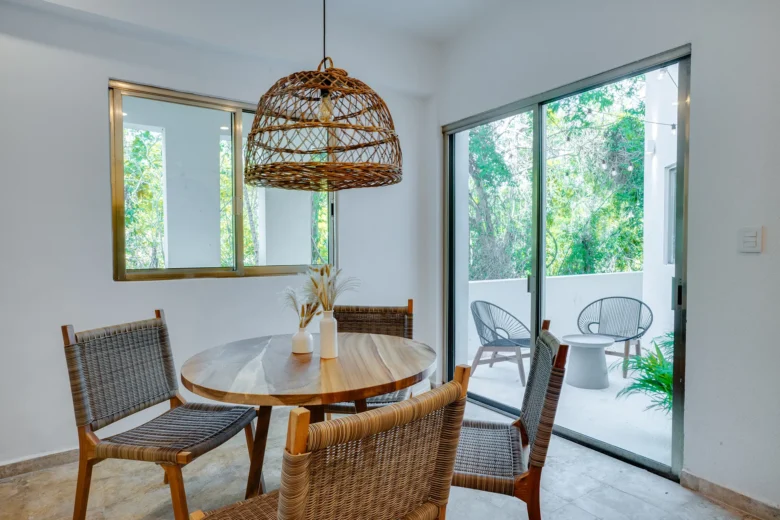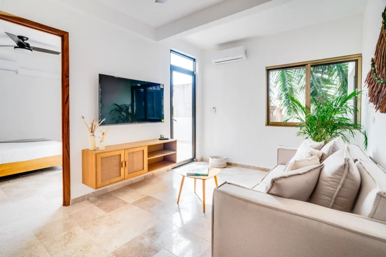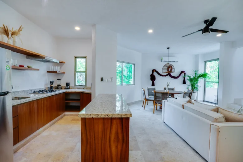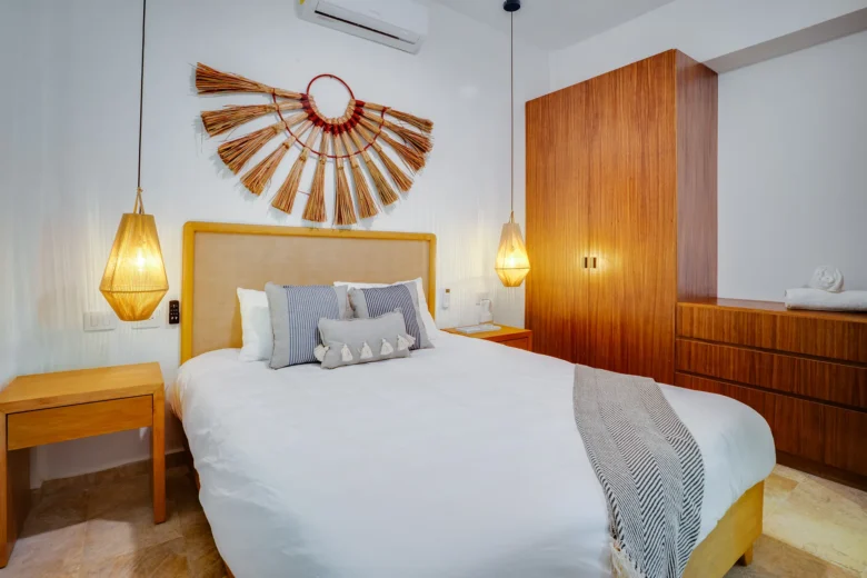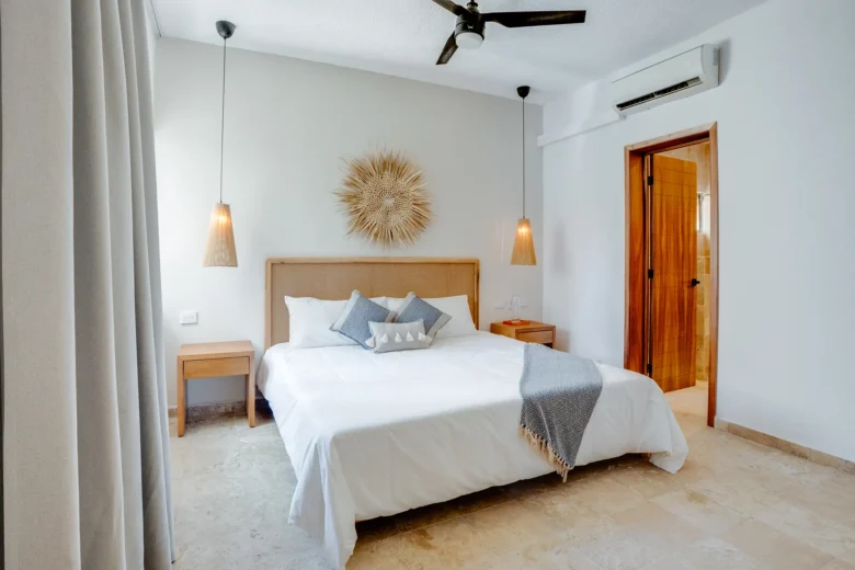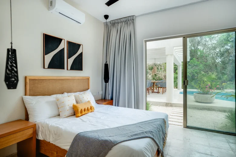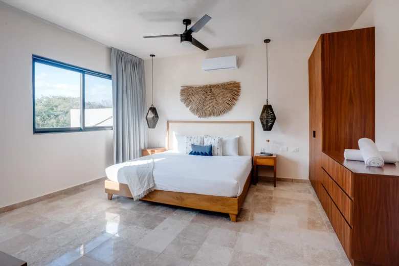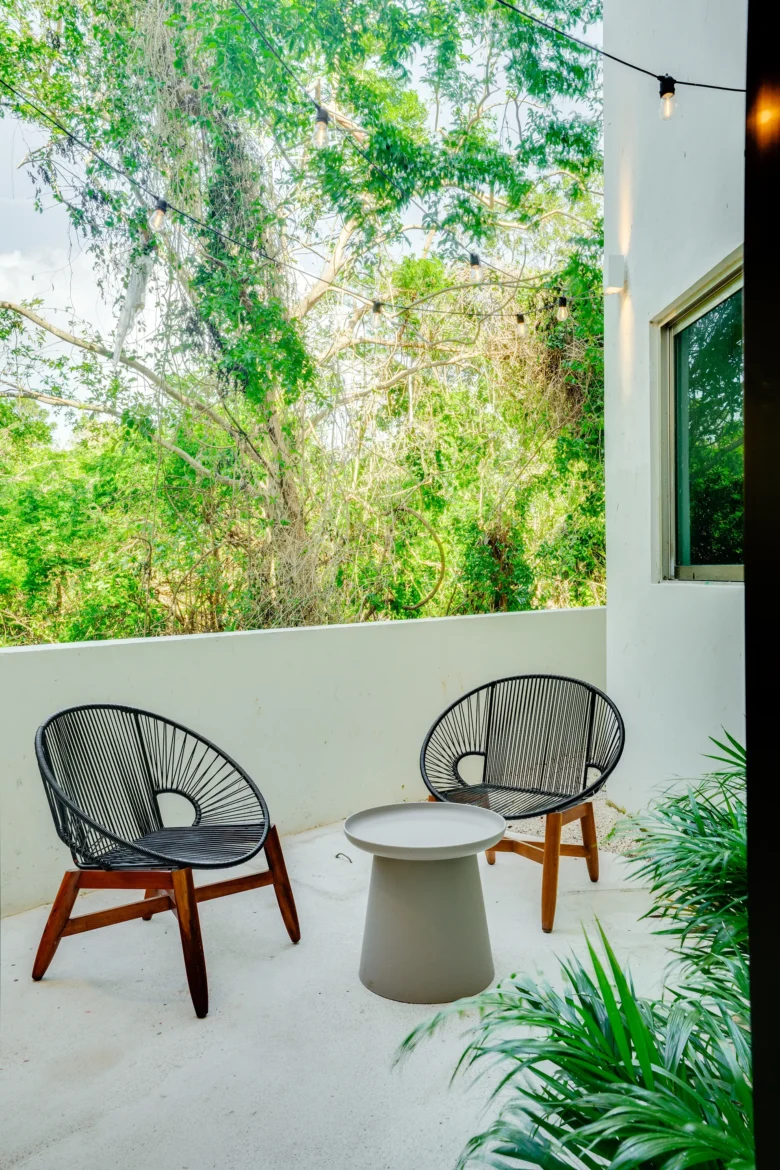 Located on the upper level, this 98m² apartment offers a peaceful retreat with extra privacy and a view of the surrounding jungle.