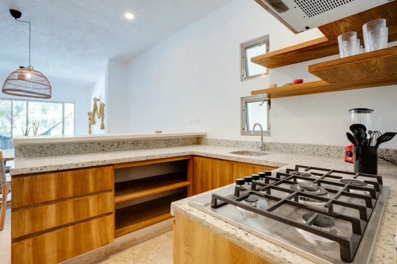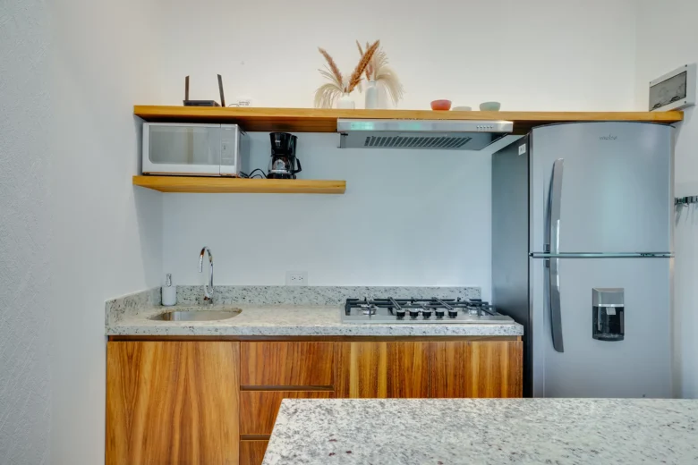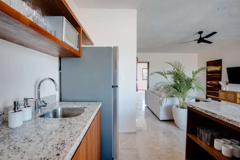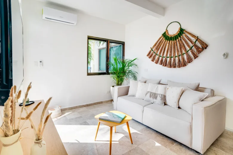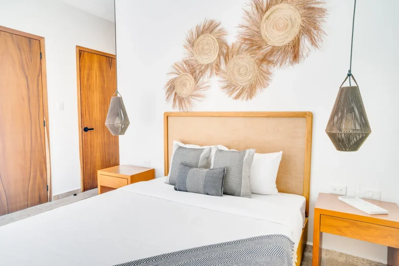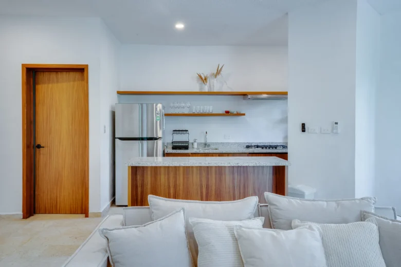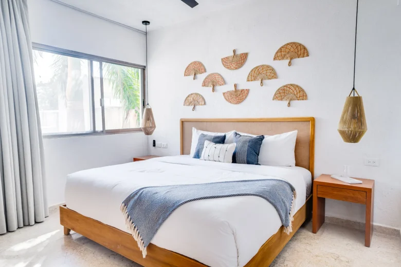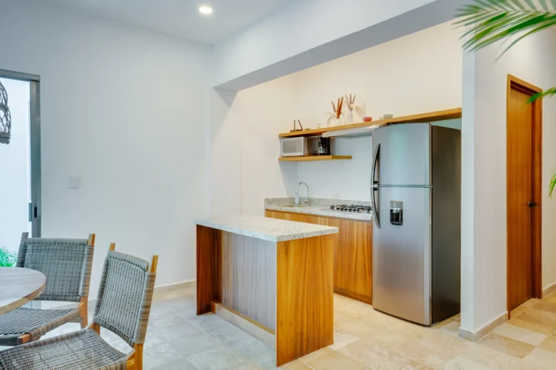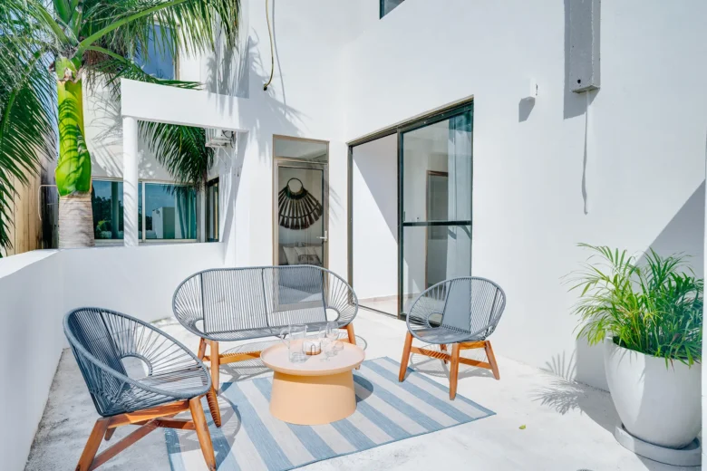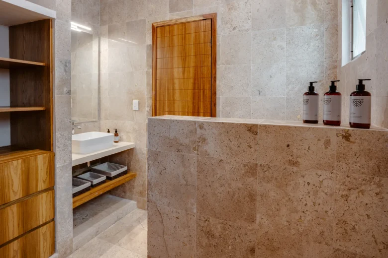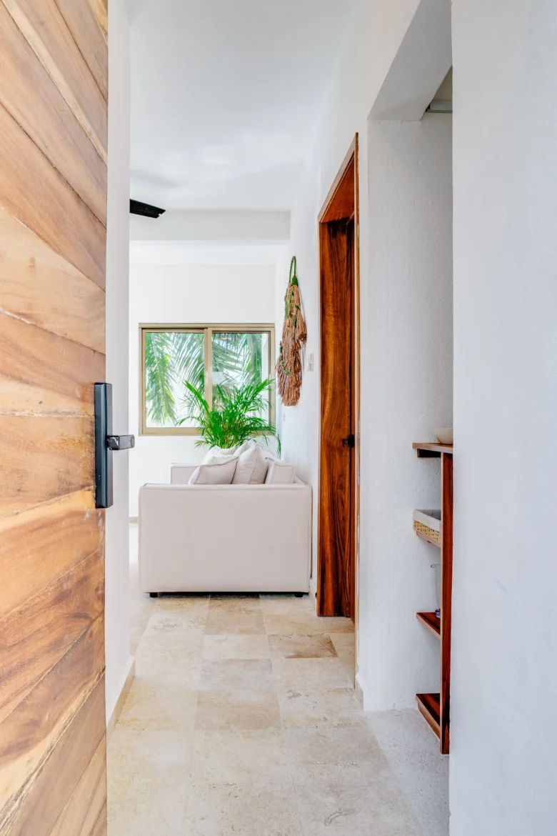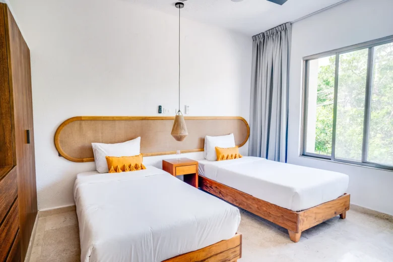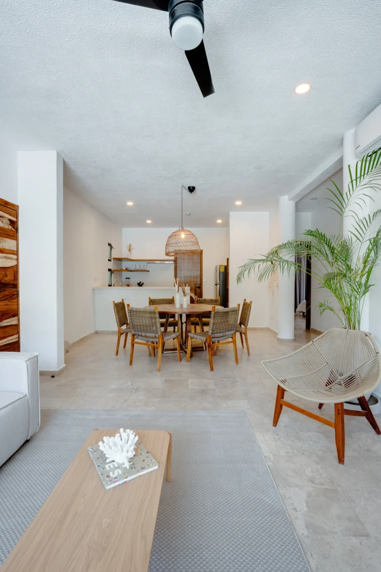 Located on the upper level, this 98m² apartment offers a peaceful retreat with extra privacy and a view of the surrounding jungle.